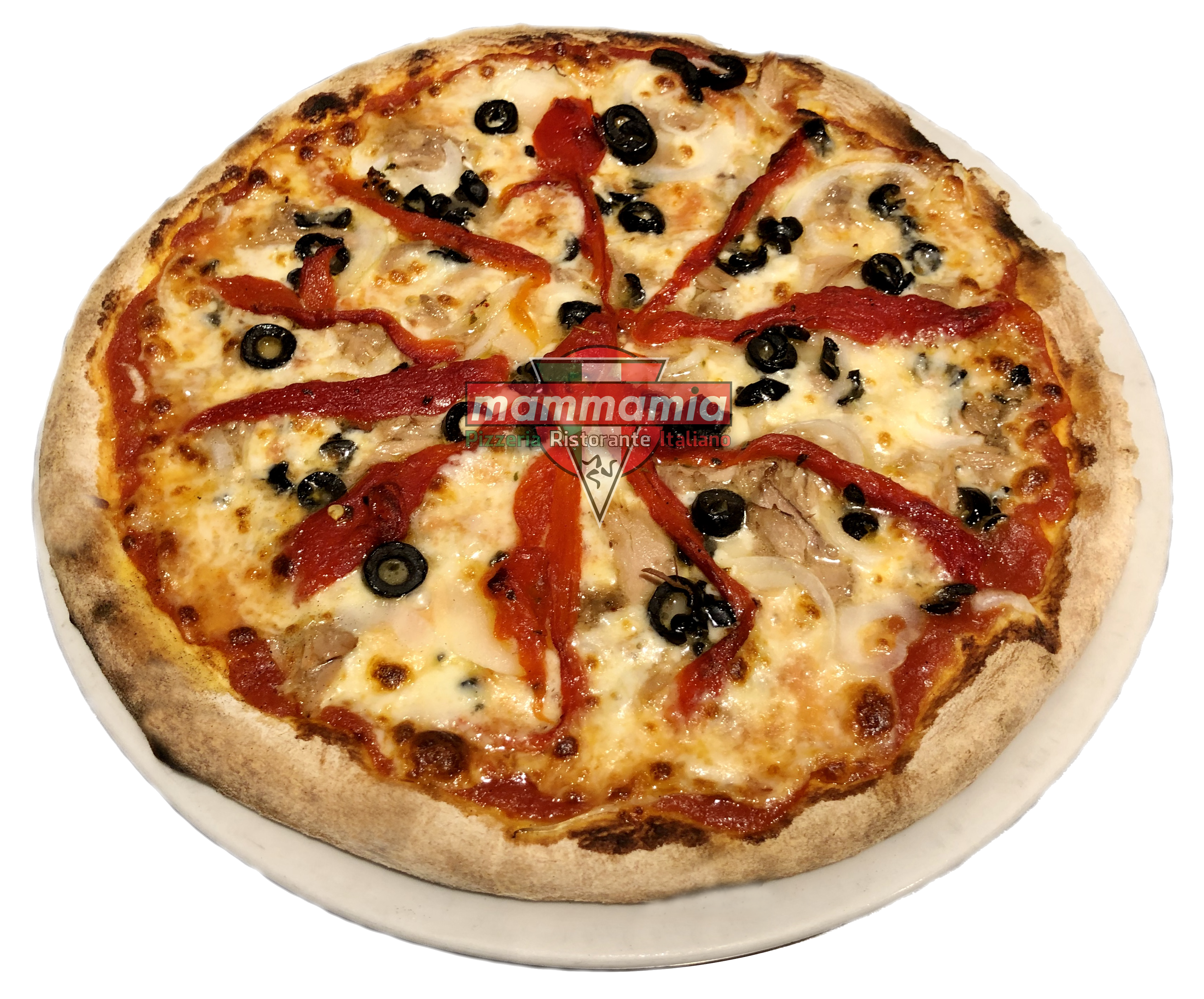 | Mamma Mia | Tomatensaus, Mozzarella Kaas, Tonijn, Ui, Rode Peper, Zwarte Olijven |