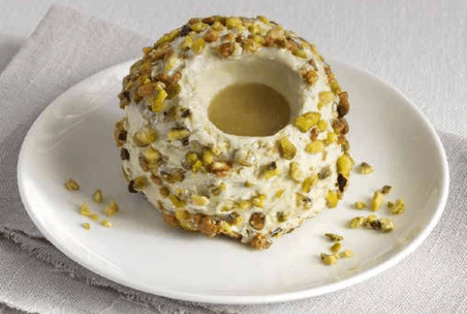 Helado de Pistacho decorado con avellanas caramelizadas y granitos de pistacho.